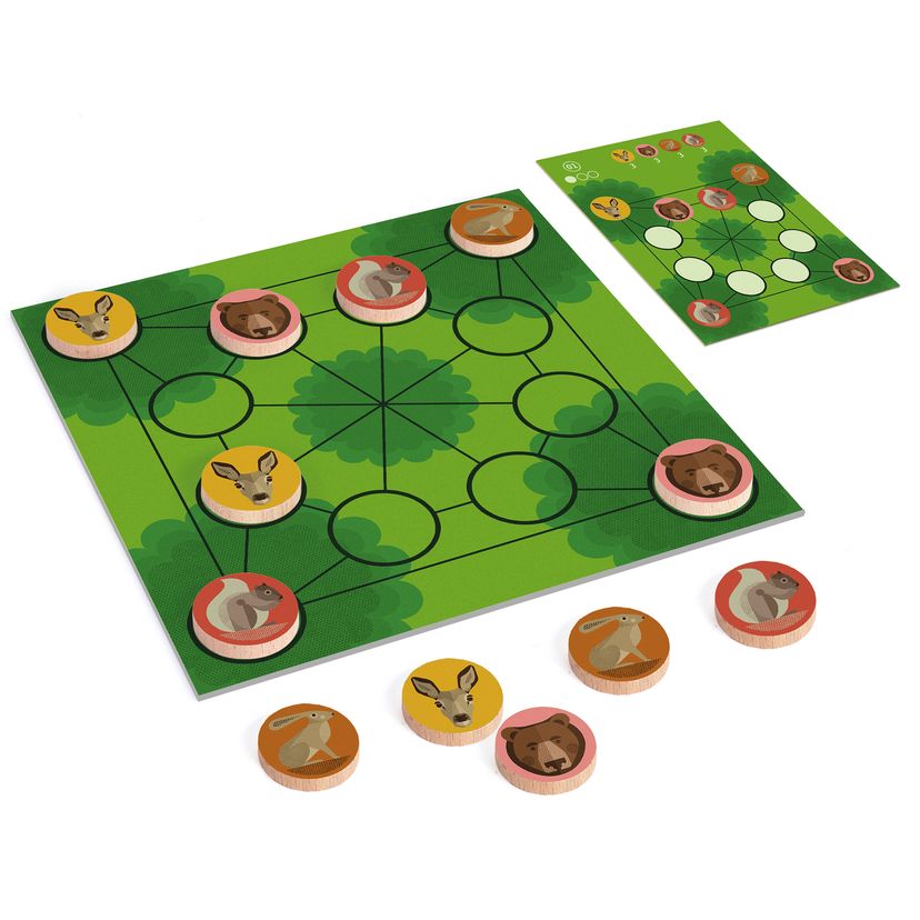 Die Tiere des Waldes leben harmonisch zusammen, solange sie ihr jeweiliges Territorium respektieren. Das ist jedoch gar nicht so einfach. Wer schafft es, alle Tiere trotz Vorgaben auf dem Spielbrett unterzubringen? So darf z.B. zwischen zwei identischen Tieren keine gerade Linienverbindung bestehen, und ein Rehkitz muss stets mit einem Reh in direkter Linie verbunden sein. Ein kniffliges Logikspiel mit drei Schwierigkeitsstufen, das allein oder mit mehreren gespielt werden kann. Für jede Aufgabe gibt es nur eine Lösung und die findet man für alle Fälle in der Spielanleitung.