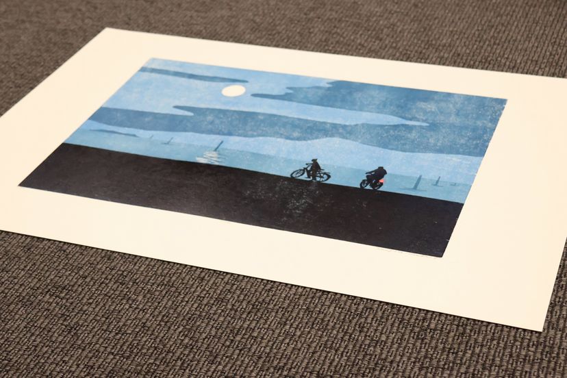 Fünf Farben, fünf Platten – erst vereint ergeben sie ein Ganzes. Das Kapitel „Unbezwingbar“ in Die Ballade eröffnet der Holzschnitt Tide. Fast fühlt man beim Betrachten des stimmungsvollen Motivs von Franziska Neubert den Wind um die Ohren pfeifen.
