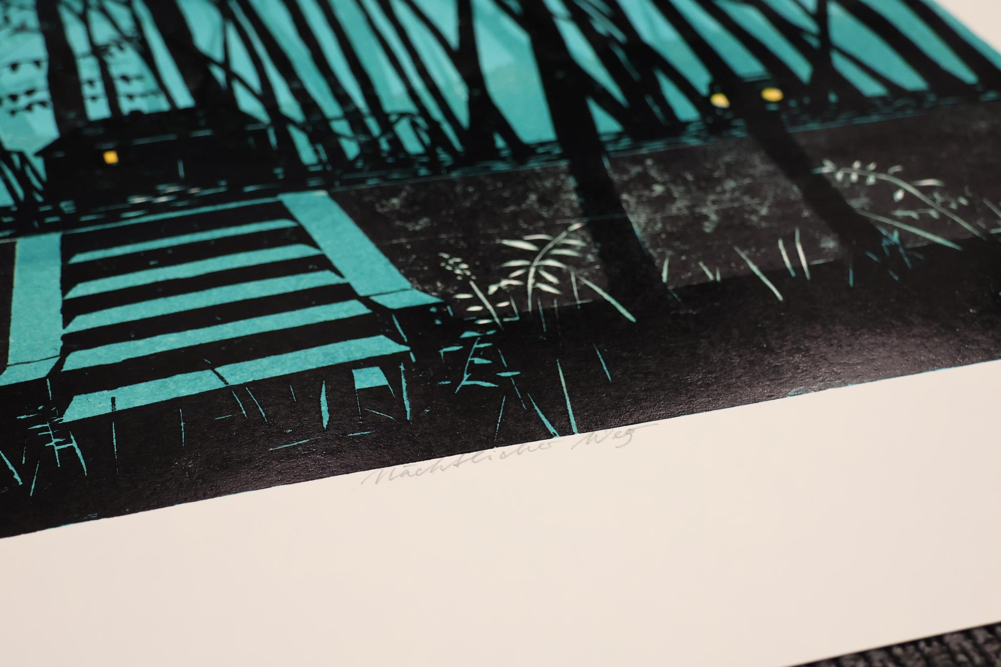 Fünf Farben, fünf Platten – erst vereint ergeben sie ein Ganzes. Das Kapitel „Schaurig“ in Die Ballade eröffnet der Holzschnitt Nächtlicher Weg. Ein Weg durch massige Farben, Mitternacht und Mondschein.