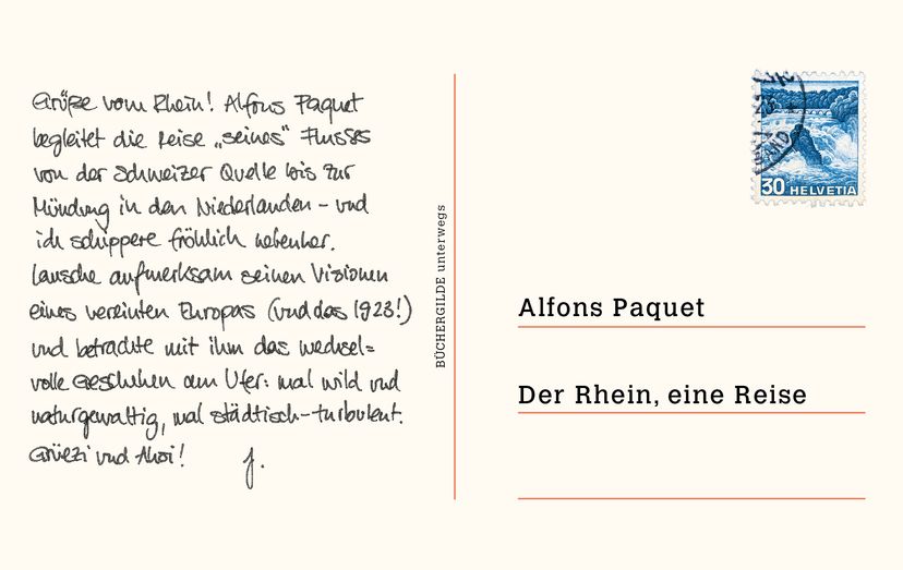 Verwurzelt im Gebiet zwischen Rhein und Main, setzte sich der Weltreisende Alfons Paquet für eine friedliche europäische Gemeinschaft ein. Seine Ideen zu gesellschaftlichen Utopien und seine visionäre politische Rhein-Idee zeichnen ihn als Pazifisten und modern denkenden Europäer aus. Paquets Kurzreportagen entlang des Rheins vermitteln starke Landschaftsbilder und detaillierte Städtebeschreibungen: Da trifft das helle, wie auf Dur gestimmte Rauschen des sanften, pastellfarbenen Schweizer Rheins auf die belebten Brücken von Rotterdam, wo sich kantige Fabriken neben den zu Bündeln geordneten Takelwerken der Seeschiffe aufreihen und verwitterte Rheinboote am Heck die Namen ihrer Heimatorte preisgeben.